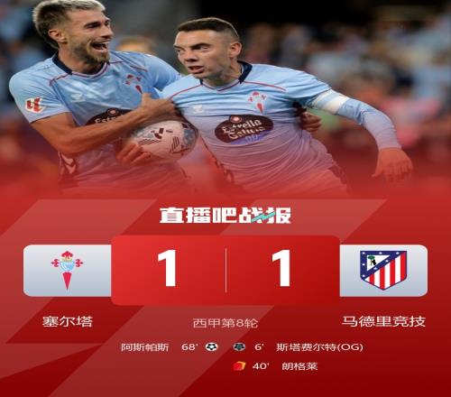 马竞本轮1-1战平塞尔塔,阿斯帕斯进球,朗格莱第40分钟染红令马竞陷入被动。