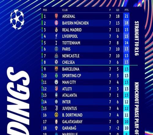 北京时间1月29日,欧冠联赛阶段最后一轮18场比赛全部结束了上半场的争夺。上半场结束后,曼城进入前八名,切尔西...